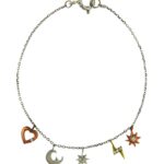 Pulsera de plata esterlina con colgantes de luna, estrellas, rayo y corazón. 15.5+3cm rayo. Colgantes bañados de oro.